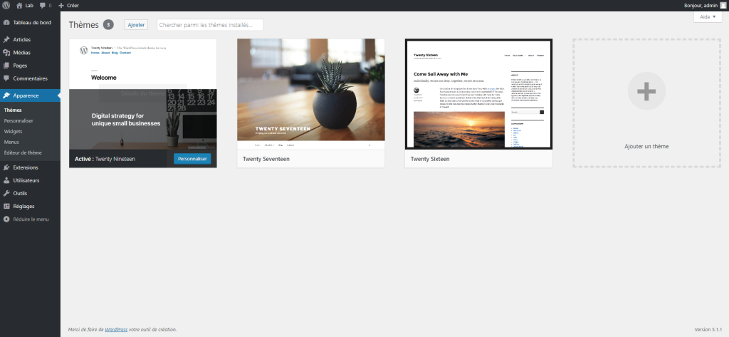 Par défaut, WordPress vous en propose 3 que vous allez retrouver dans la rubrique « Apparence » puis « Thèmes ». Mais vous pouvez très bien en ajouter d’autres.