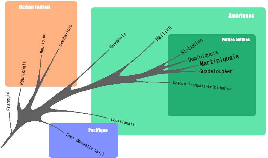 Parenté entre Créoles à base lexicale Française – Source : WikipédiaEn effet chaque DOM dispose de ses spécificités et tous les créoles ne se ressemblent pas. Par exemple le créole Guadeloupéen et le créole Réunionnais sont très différents, et si l’on souhaite traduire son site en créole il faudra choisir un DOM spécifique ou bien effectuer plusieurs traductions. Dans tous les cas, nous recommandons d’effectuer la traduction vers le créole du département d’outre-mer où vous êtes le plus fortement implanté.